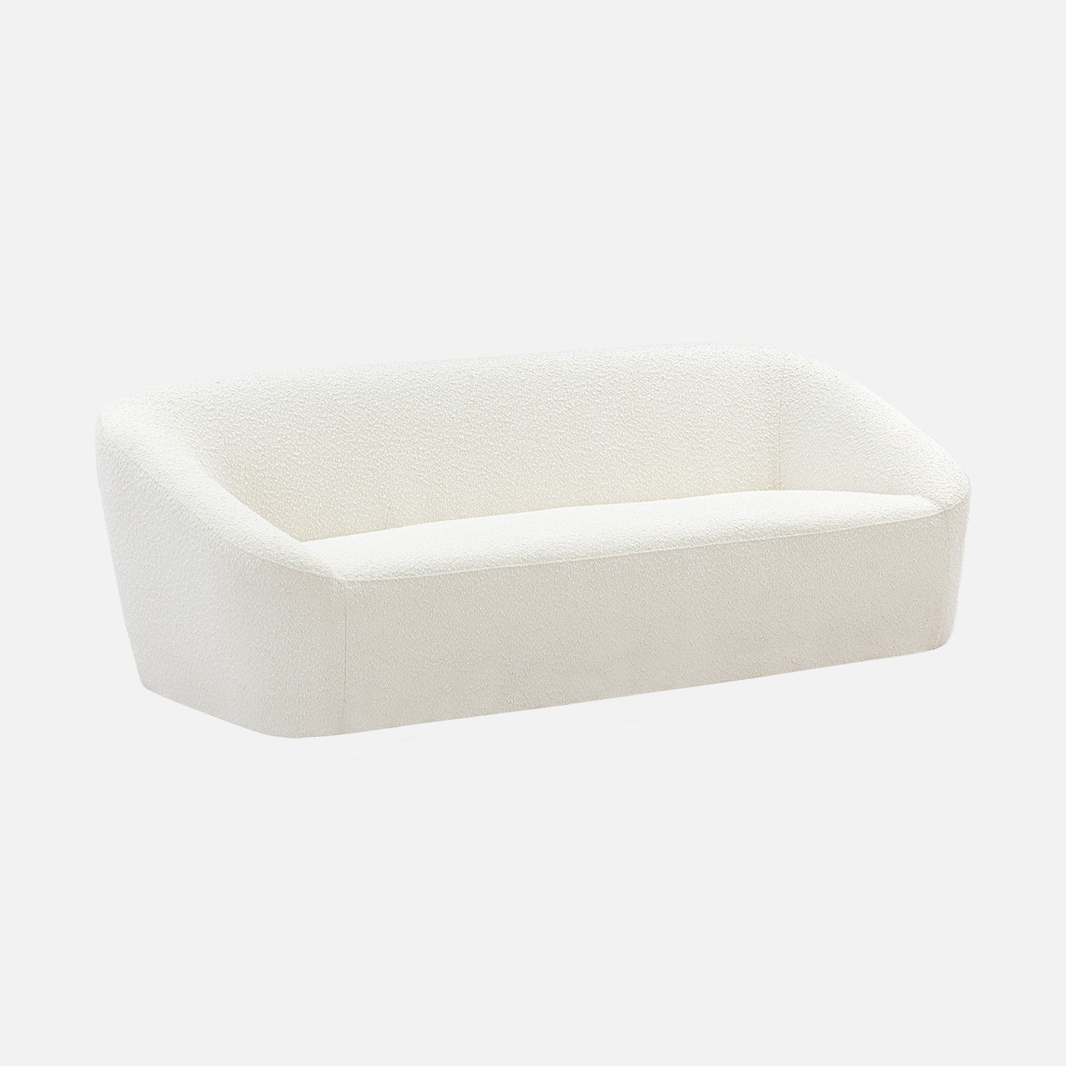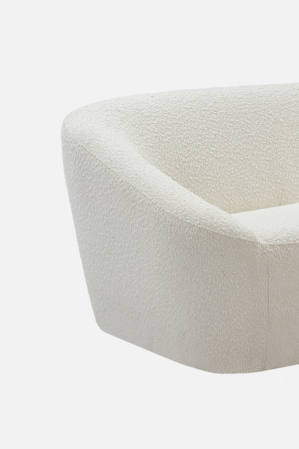 Contemporary white fabric sofa with a sleek, minimalist design and curved silhouette. The couch features an armless, low-profile structure with smooth, continuous lines and a comfy cushioned seat. Upholstered in soft textured fabric, this modern loveseat-style sofa presents a clean, sculptural aesthetic, ideal for modern, Scandinavian, or minimalist interiors.