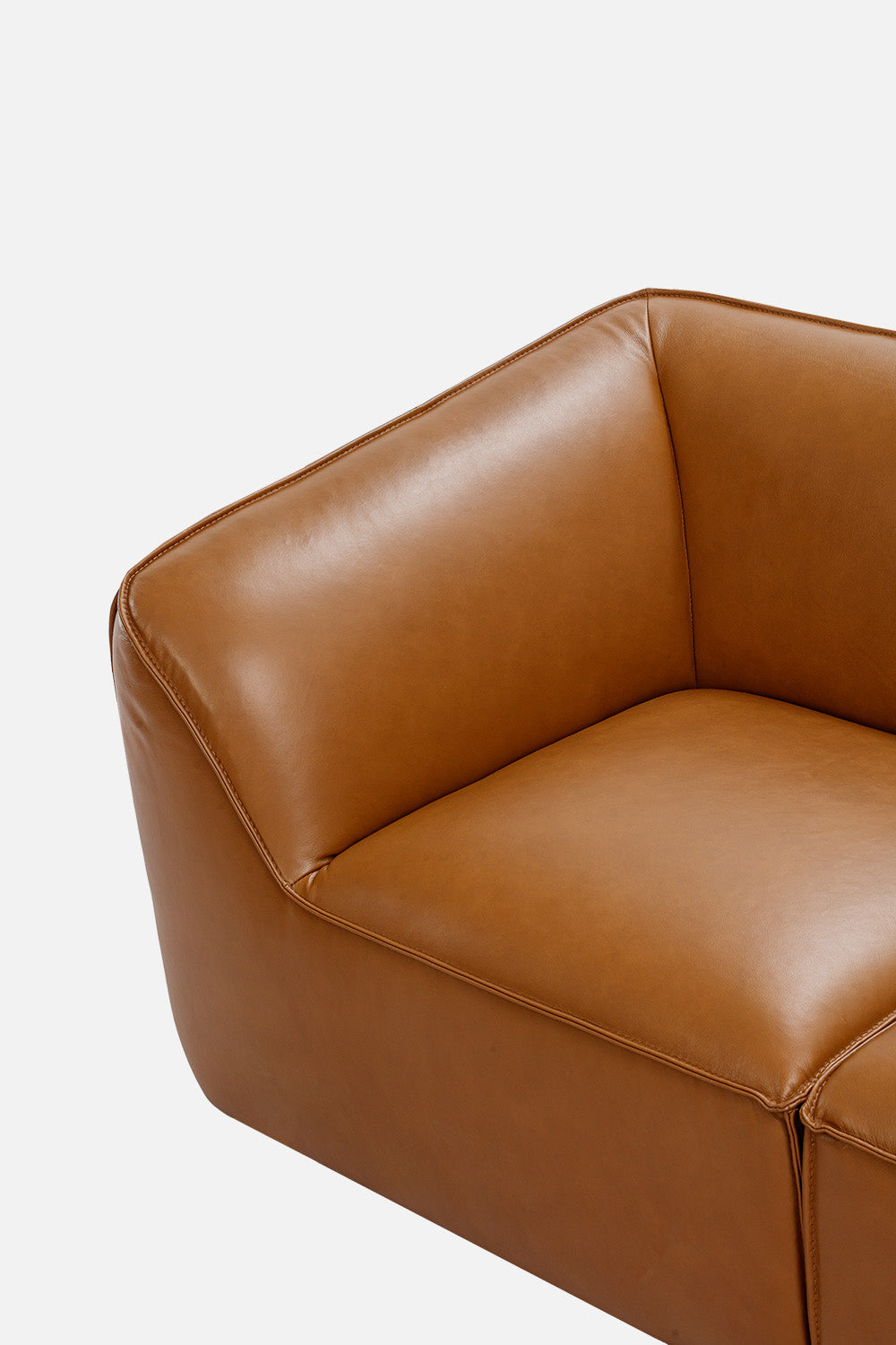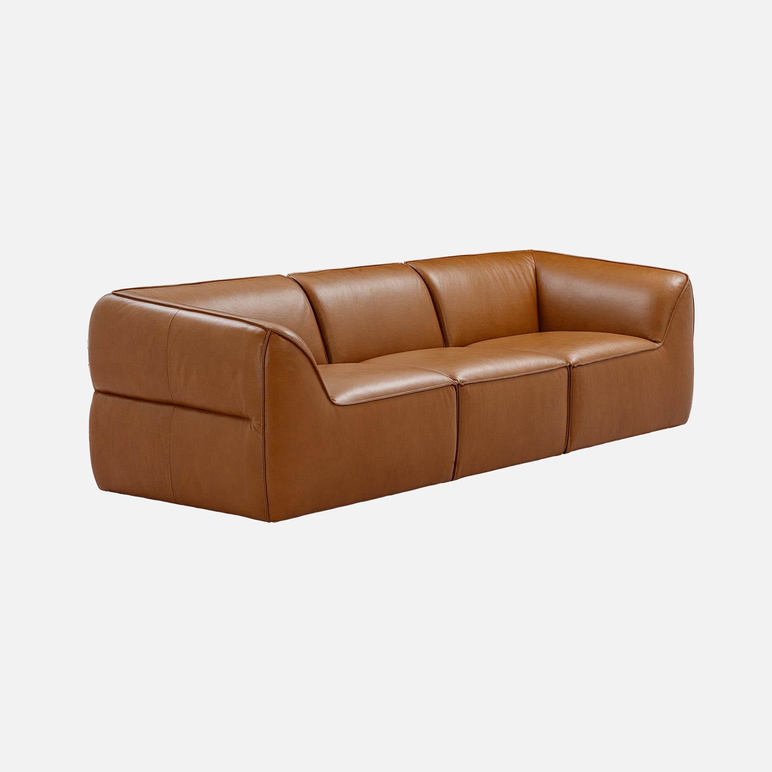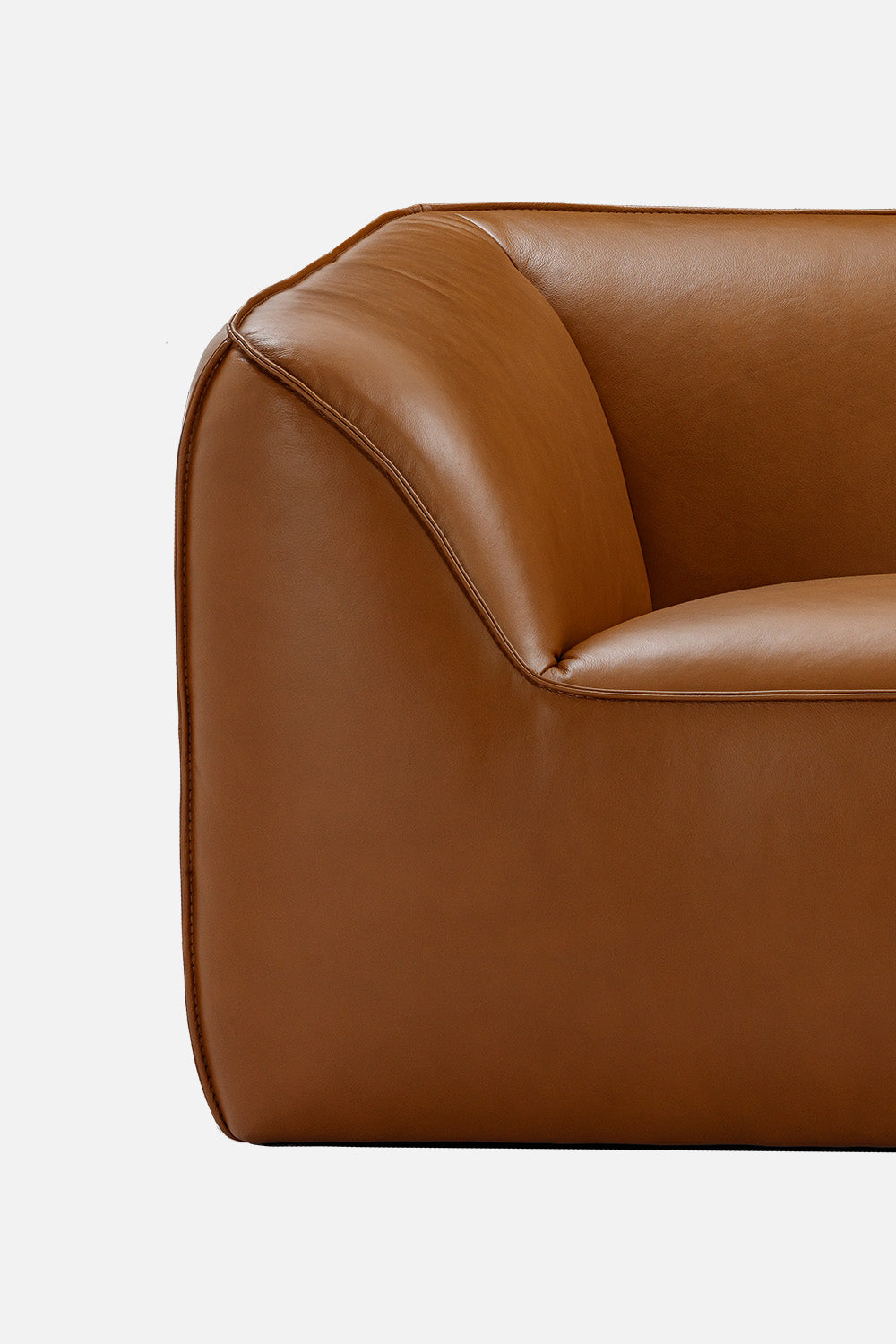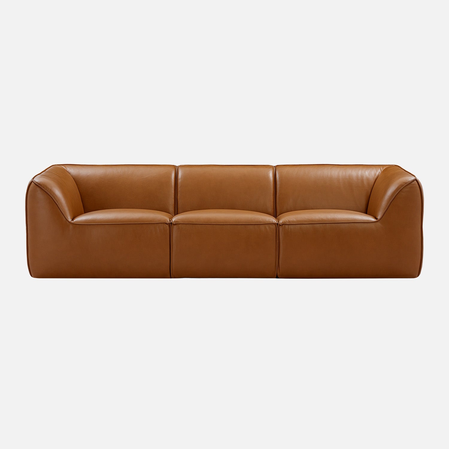 Luxurious tan leather sofa with a modular design and wide, blocky form. This couch features subtly curved backrests, and leather upholstery that accentuates its plush and sculptural silhouette. The leather upholstery adds a refined, polished appearance, making it a standout piece in contemporary or upscale living spaces.