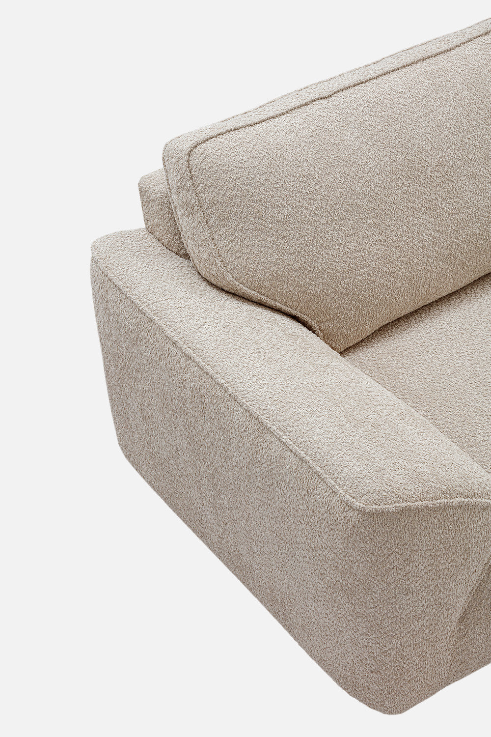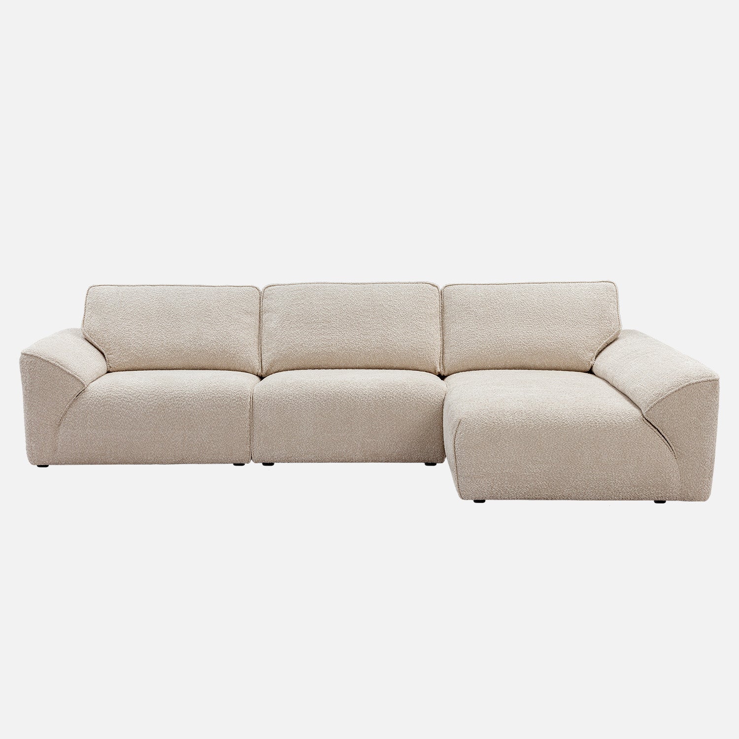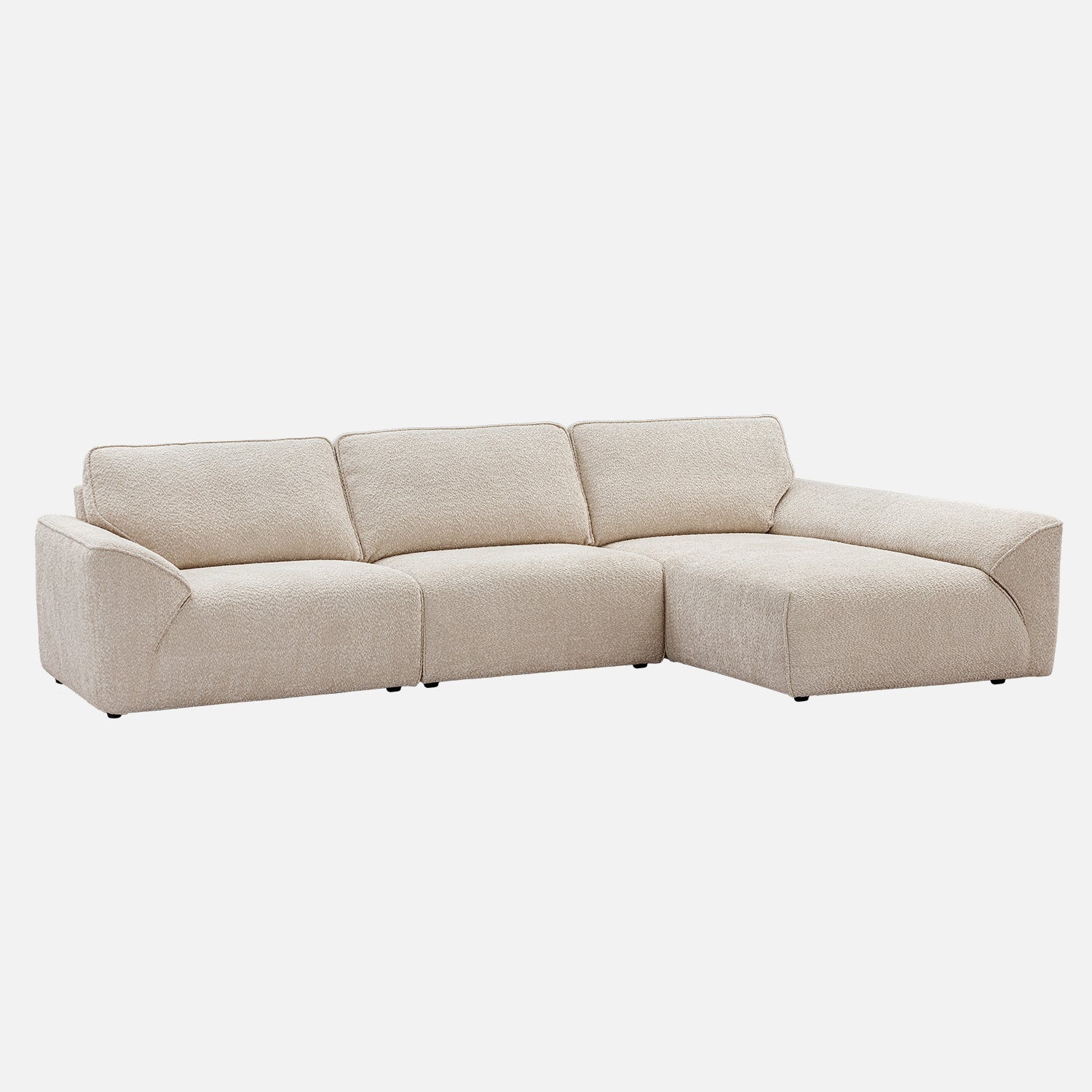 Modern beige sectional sofa with right-facing chaise lounge, upholstered in soft textured fabric. This contemporary L-shaped couch features wide seats, subtle curves along the arms and backrest, and plush cushioning for enhanced comfort. The sofa offers a seamless and grounded look suitable for minimalist, modern, or neutral-toned living spaces. It evokes a warm, inviting atmosphere, while the clean lines and spacious seating provide a sense of calm and effortless sophistication—ideal for unwinding or entertaining in a serene, modern home.