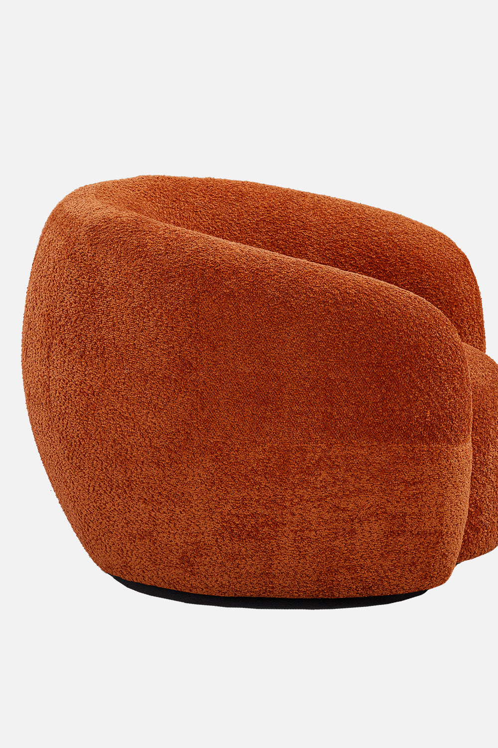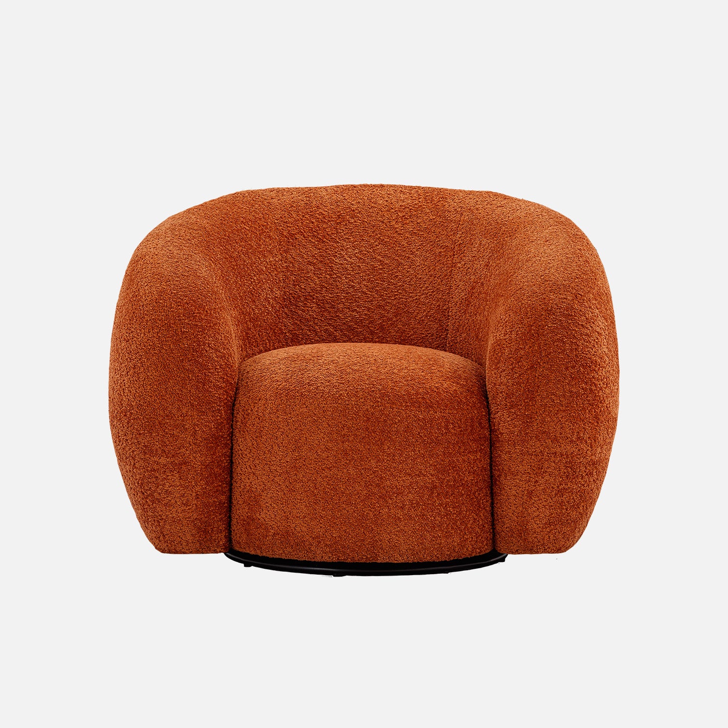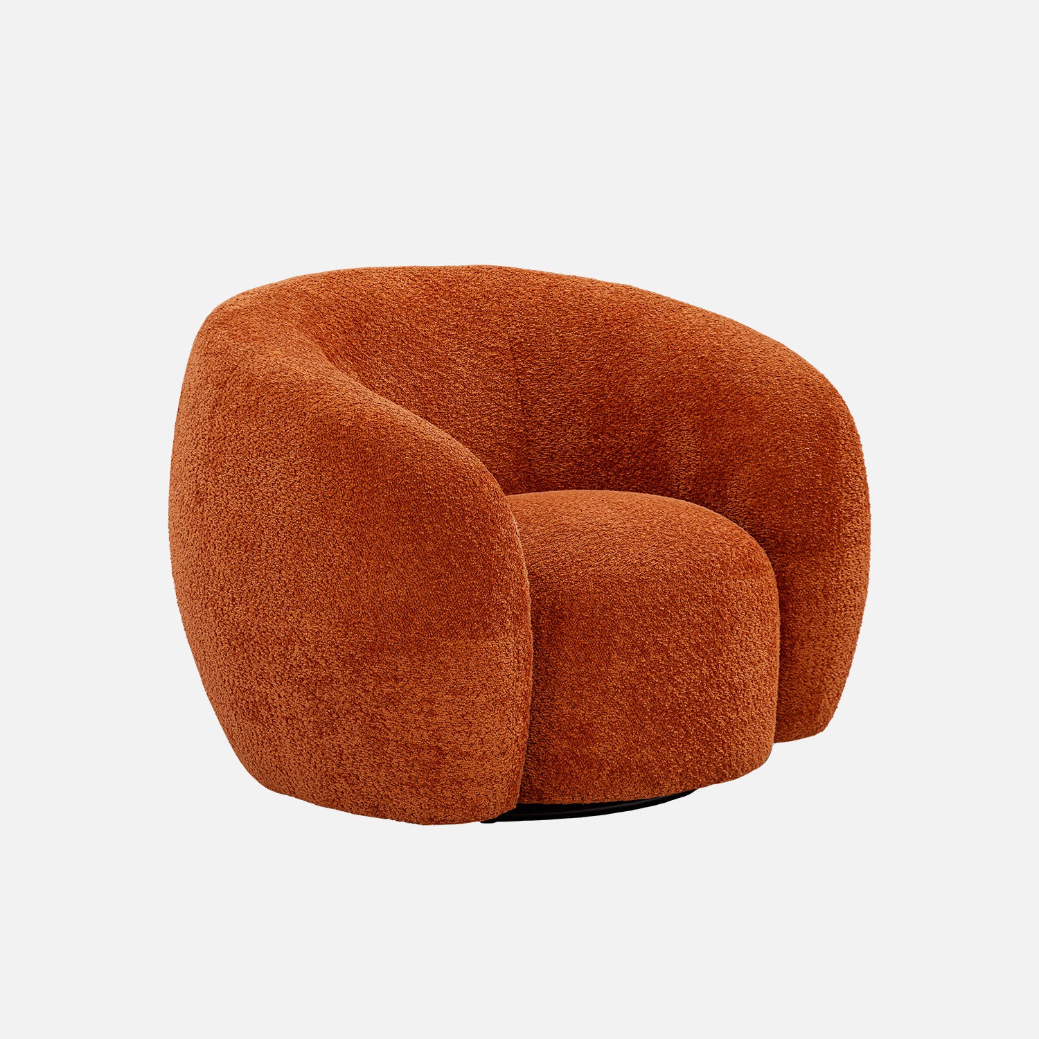 The N2260 Armchair accompanies the N2260 Sofa. A modern burnt orange boucle swivel chair with rounded, barrel-style silhouette and fully upholstered design. This contemporary accent chair features plush, textured fabric with a soft, cozy finish, curved backrest, and armless construction. The base is subtly concealed, allowing for a smooth 360-degree swivel motion. Ideal for modern, mid-century, or eclectic interior decor, the chair combines bold color with inviting form for a standout seating option.