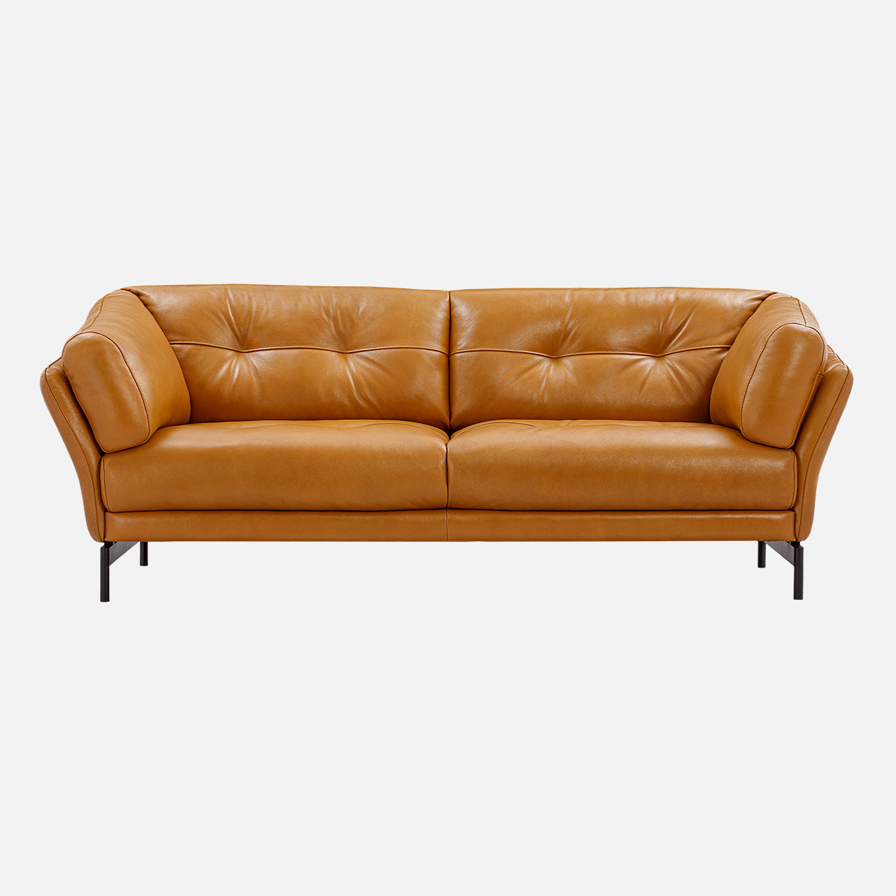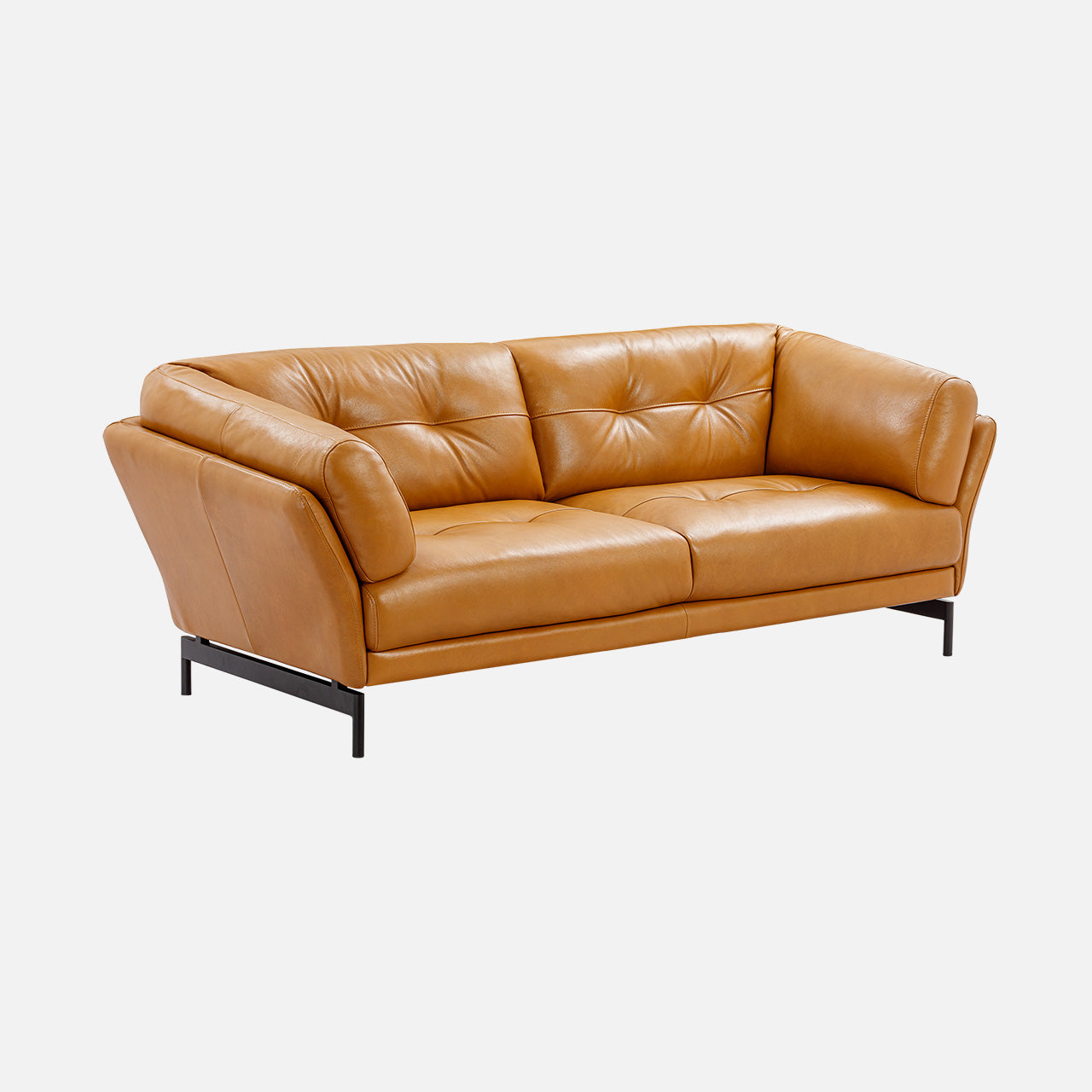 Modern leather sofa with tufted backrest and angled armrests, set on slim black metal legs. This contemporary sofa features plush cushioning, luxurious aniline leather upholstery, and a subtly flared silhouette that blends mid-century and industrial design elements. The warm tan tone and luxurious texture make it a stylish and inviting, perfect for cozy yet elevated living spaces.